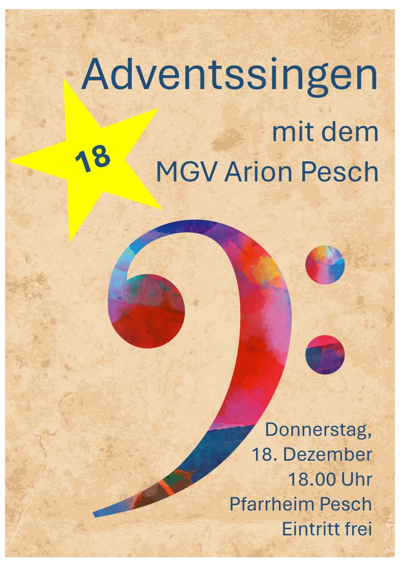 Wir treffen uns im Pfarrheim Pesch am Donnerstag, dem 18.12.2025, um 18 Uhr zum Adventssingen. Groß und Klein sind bei freiem Eintritt herzlich eingeladen. Wir freuen uns auf viele Gäste die nicht nur hören sondern auch mitsingen möchten.