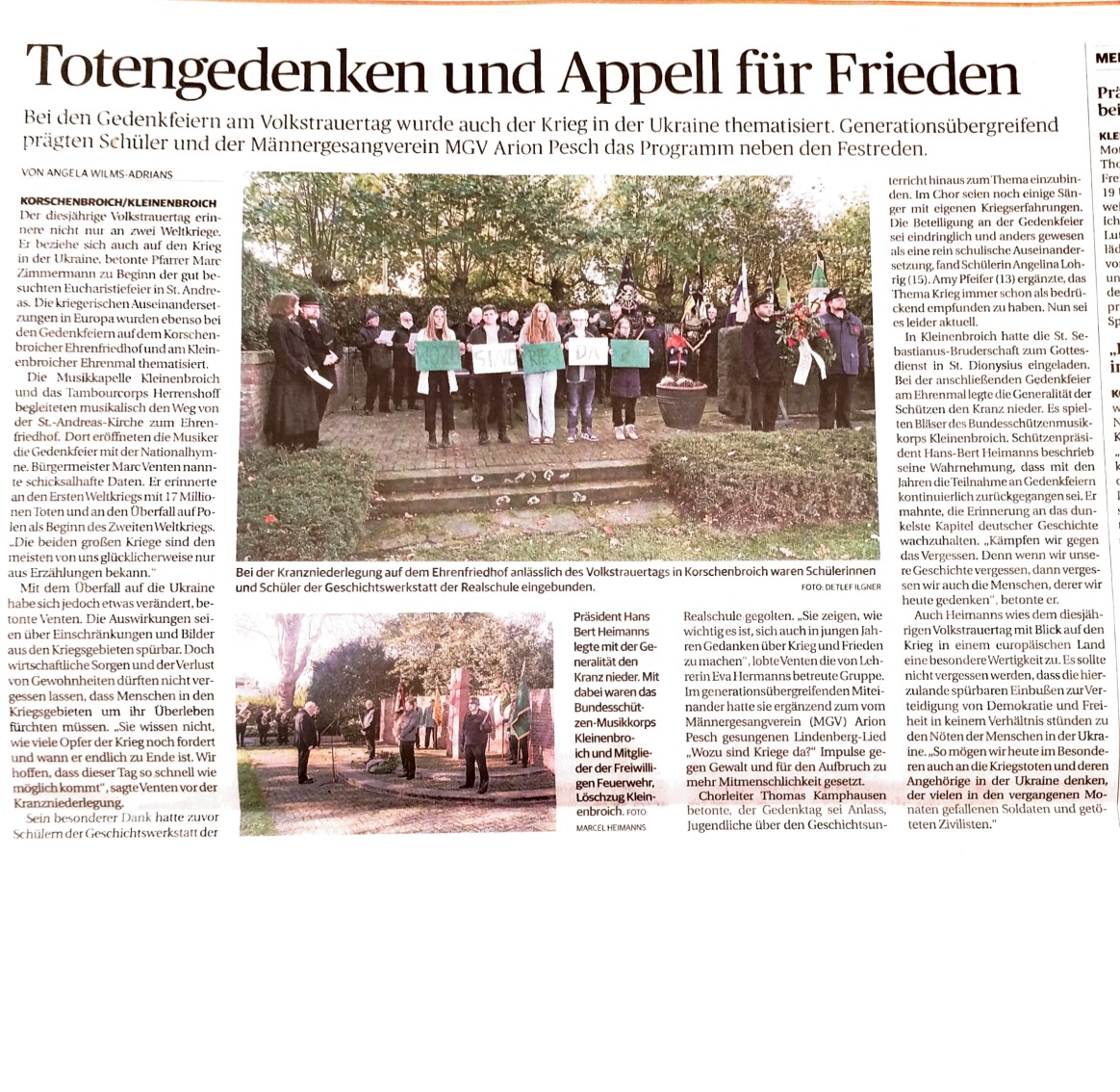 Bei den Gedenkfeiern am Volkstrauertag wurde auch der Krieg in der Ukraine thematisiert. Generationsübergreifend prägten Schülerinnen und Schüler und der Männergesangverein MGV Arion Pesch das Programm neben den Festreden.